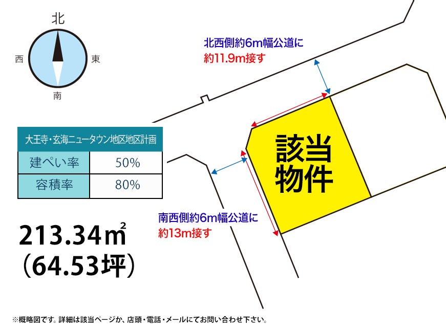 | 接道 | 南西側約6m幅公道に約13m、北西側約6m幅公道に約11.9m接す |